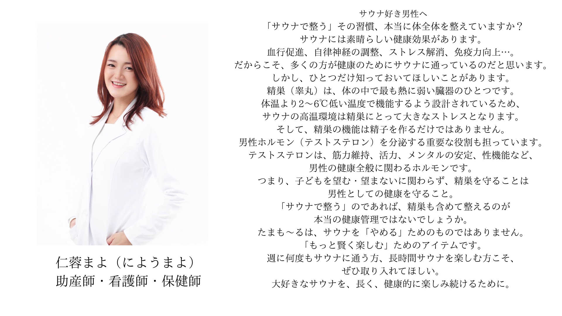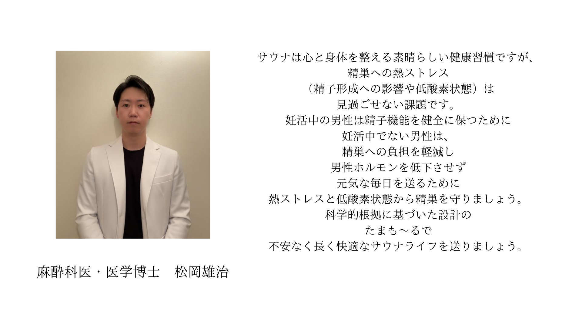 - 私は整うという言葉がなかった頃からのサウナーで歴は15年以上になります。 家にサウナも作り、週2回程度コンスタントに入っています。長年サウナを楽しんでいるからこそ、サウナの高温による男性機能の影響を知った時にショックを受けました。サウナ愛好家には私のように健康や自己パフォーマンス向上に意識の高い方が多いと思います。男性機能に対するデメリットは本末転倒に感じてしまい、解決策を探しておりました。これからはサウナハットと同じく、サウナのマストアイテムとしてお世話になりそうです。