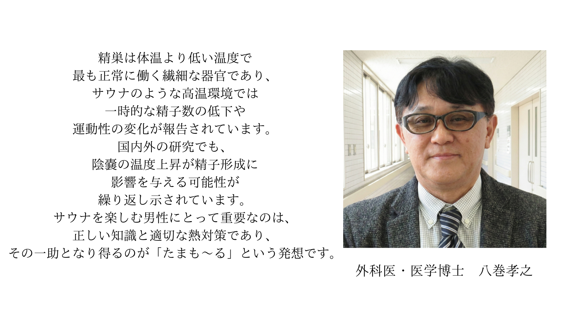 現代の医学において、精巣の温度管理の重要性は広く知られていますが、それが「不妊治療」という確立された医療スキームに組み込まれるには、まだ多くの時間が必要です。「たまも~る」は、科学的に100%の証明を待たなければ動けない医療の「隙間」を埋め、既存の生理学的理論に基づいた最善のケアを、今すぐ皆様に提供します。