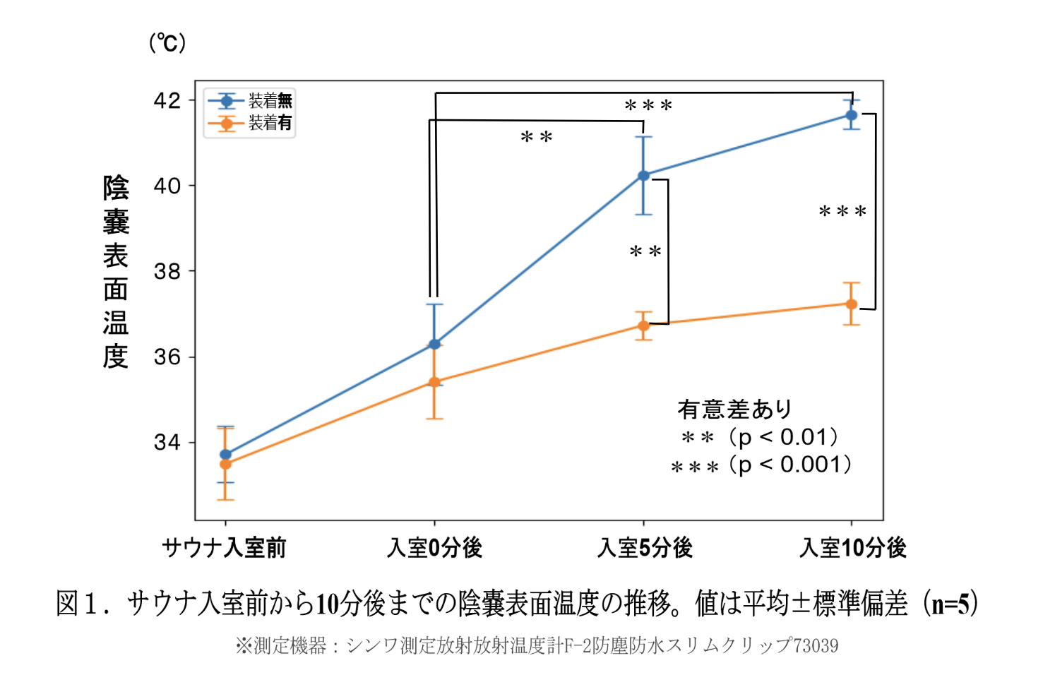 本図は、サウナ入室前から入室後10分までの間における陰嚢表面温度の推移を