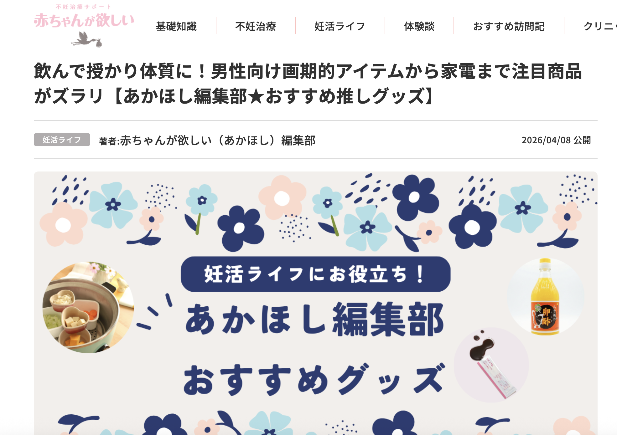 飲んで授かり体質に!男性向け画期的アイテムから家電まで注目商品がズラリ【あかほし編集部★おすすめ推し... 妊活中のみなさんに試してほしい新商品や注目情報をあかほし編集部が厳選ピックアップ☆毎日の生活を彩り、皆さまの妊活ライフを応援してくれるモノやコトをチェックしてく