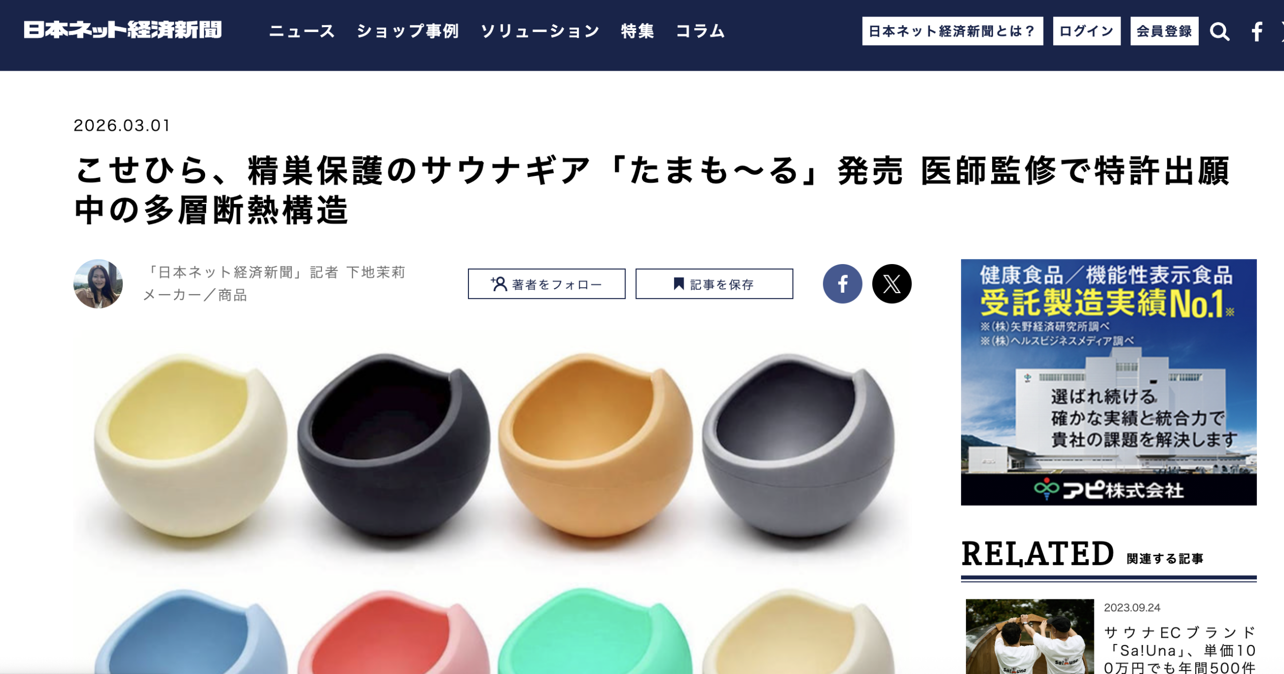 こせひら、精巣保護のサウナギア「たまも~る」発売 医師監修で特許出願中の多層断熱構造 | 日本ネット経済... こせひらは3月1日、サウナ利用時の高温環境から精巣を保護する断熱サウナギア「たまも~る」を発売する。医師監修のもと、特許出願中の多層断熱構造を採用し、サウナ中の温...